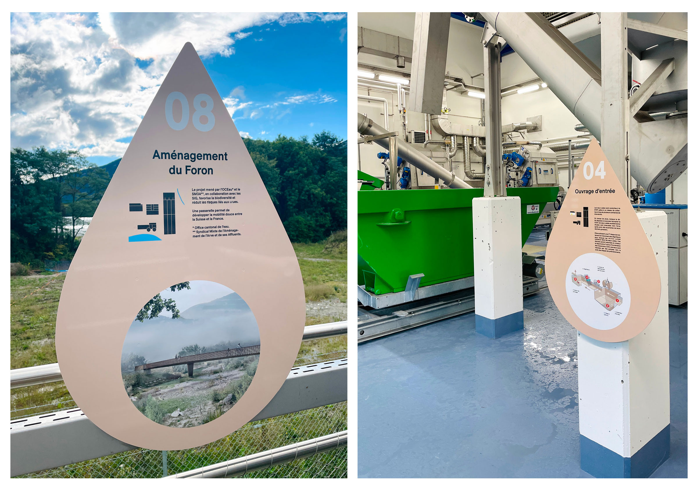 Rundgang durch die Kläranlage Villette, bestehend aus 13 Tafeln, die mit einem Plan, einem Text und einem Diagramm die Phasen der Abwasserbehandlung zusammenfassen.