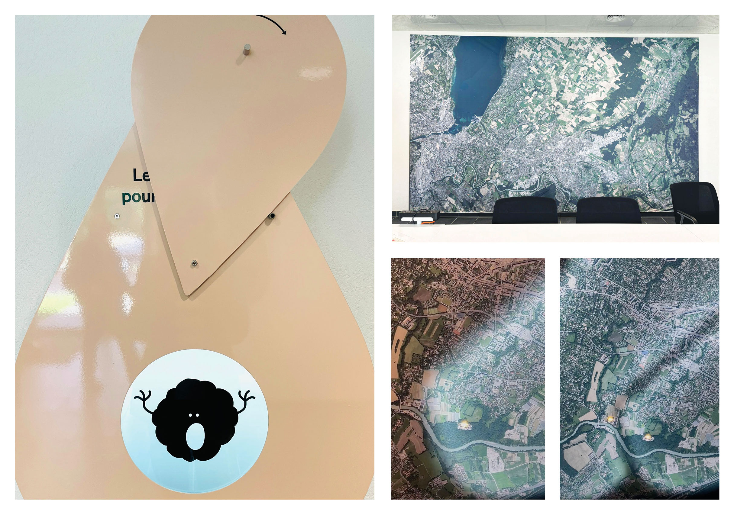 Gestaltung des Empfangsraums mit einer interaktiven Satellitenkarte der Kläranlagen Villette und Ocybèle mit Hintergrundbeleuchtung der Wassereinzugsgebiete, ergänzt durch einen Touchscreen mit den allgemeinen Zahlen der Kläranlagen im Kanton.