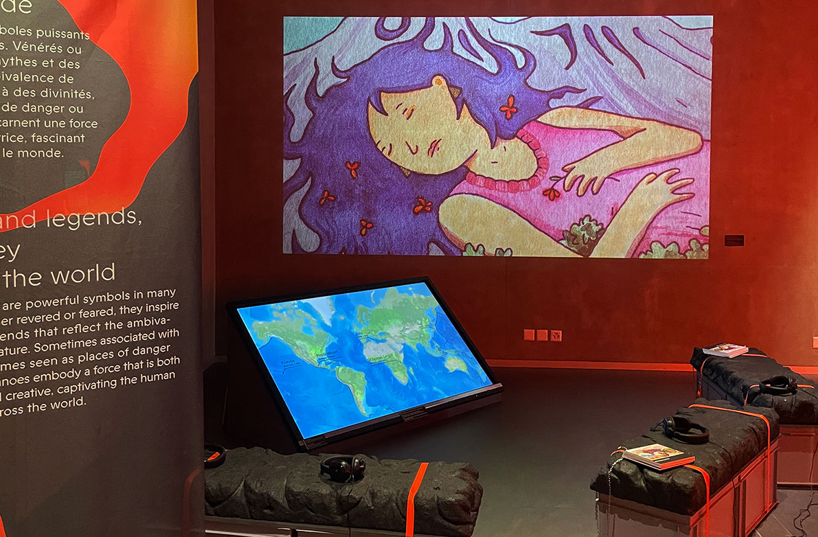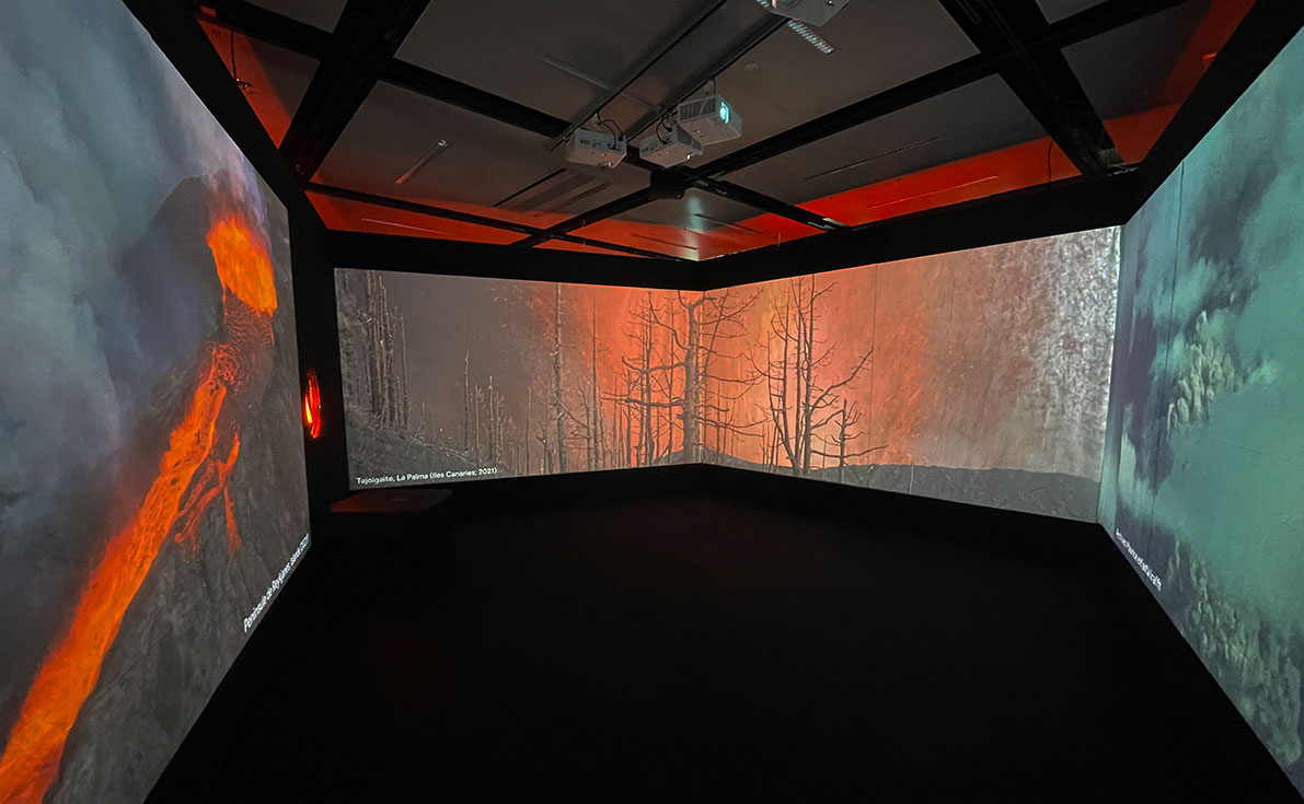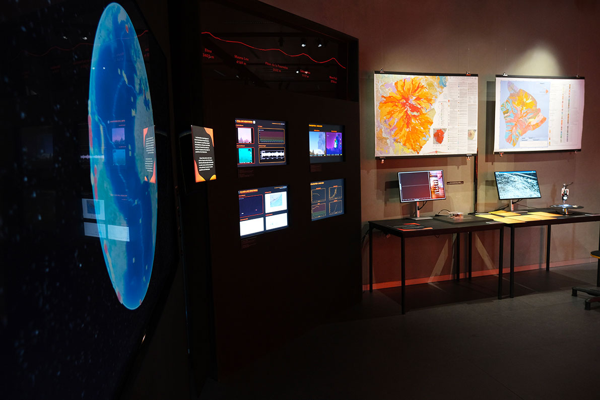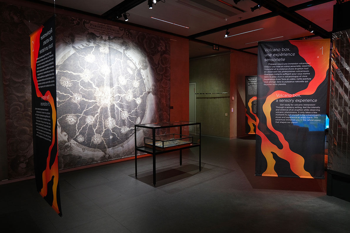 La scénographie immersive du feu de la terre interprète le regard des scientifiques qui ont cherchés à les comprendre, à en raconter les mystères et même à tenter de décrypter les signes avant-coureurs de leurs colères. Les volcans fascinent par leur silhouette majestueuse et par la puissance de leurs éruptions. Ils occupent ainsi une place ambivalente dans l’histoire humaine, à la fois redoutés pour leurs dangers et vénérés pour les richesses qu’ils offrent.