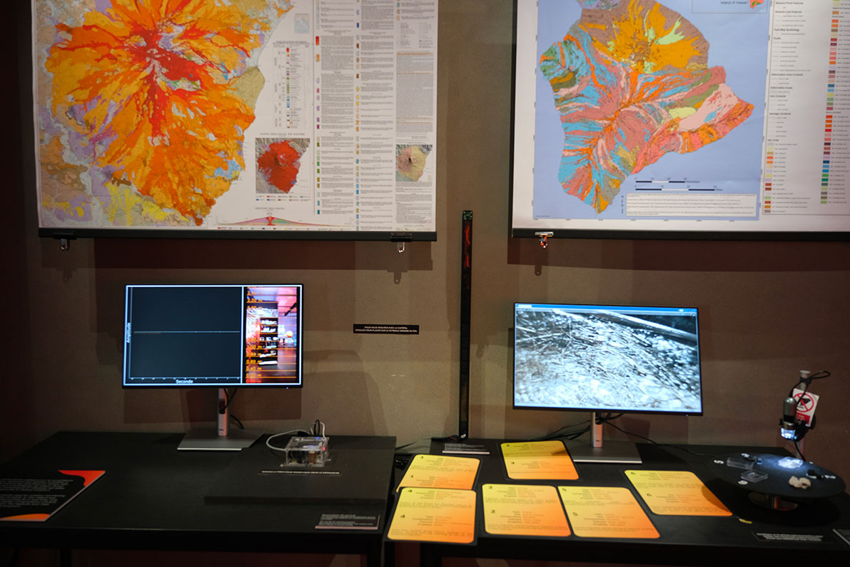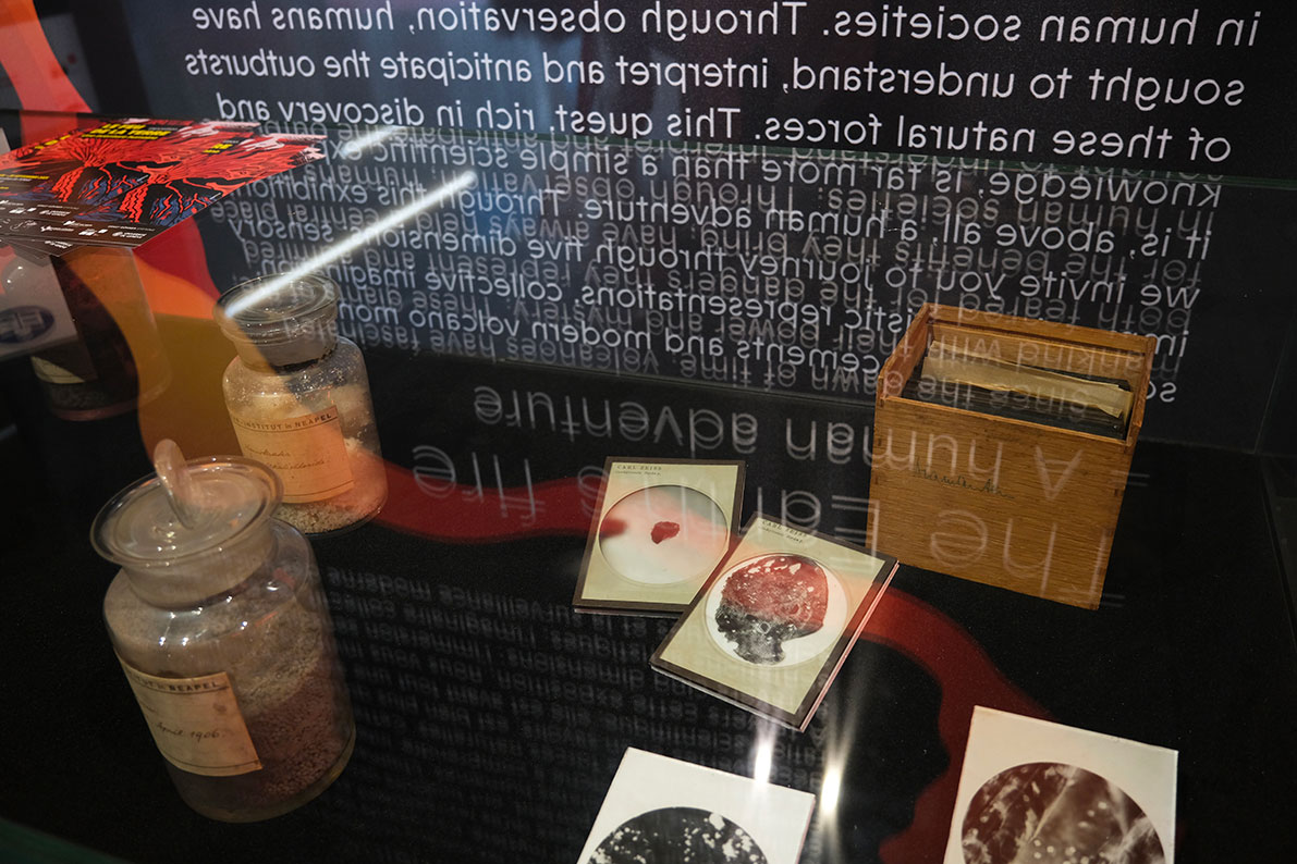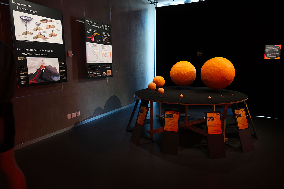 La scénographie immersive du feu de la terre interprète le regard des scientifiques qui ont cherchés à les comprendre, à en raconter les mystères et même à tenter de décrypter les signes avant-coureurs de leurs colères. Les volcans fascinent par leur silhouette majestueuse et par la puissance de leurs éruptions. Ils occupent ainsi une place ambivalente dans l’histoire humaine, à la fois redoutés pour leurs dangers et vénérés pour les richesses qu’ils offrent.